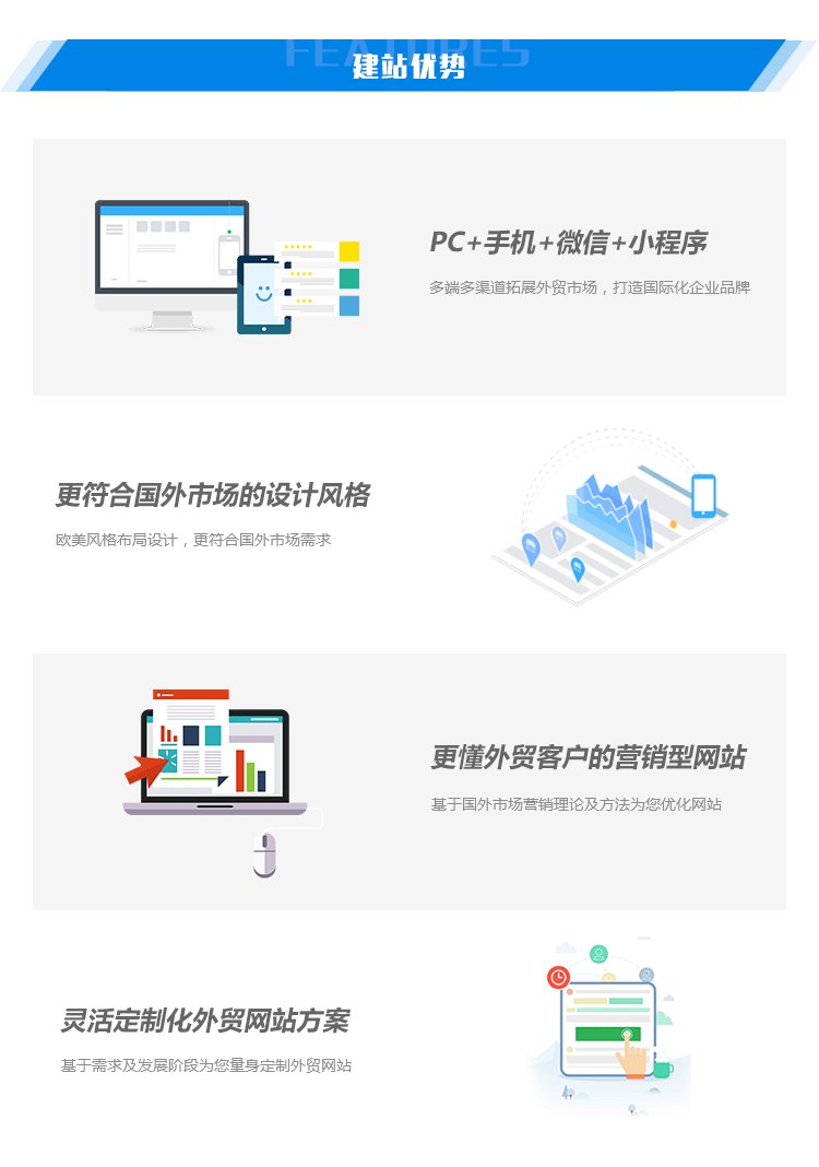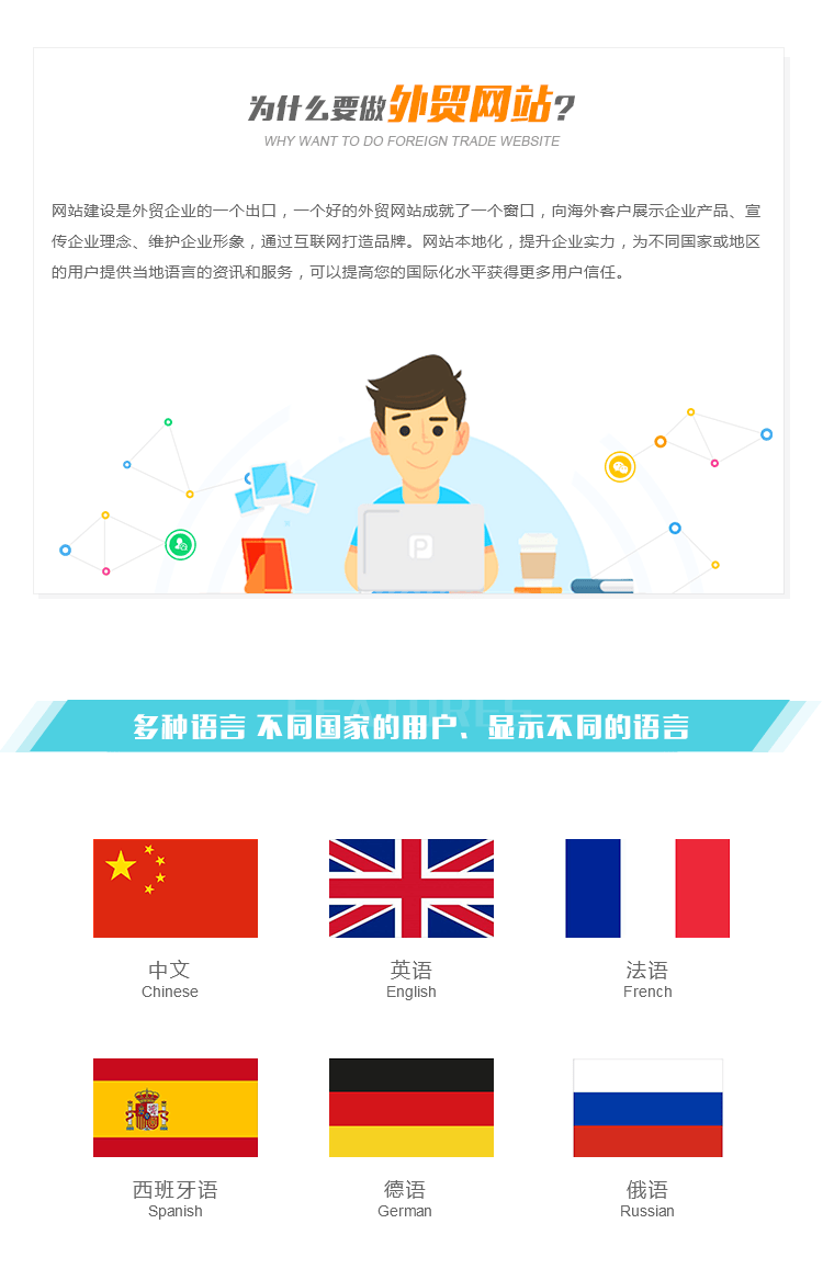 网站建设是外贸企业的一个出口,一个好的外贸网站成就了一个窗口,向海外客户展示企业产品、宣传企业理念、维护企业形象,通过互联网打造品牌。网站本地化,提升企业实力,为不同国家或地区的用户提供当地语言的资讯和服务,可以提高您的国际化水平获得更多用户信任。