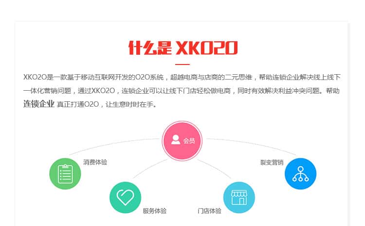 XK020是一款基于移动互联网开发的020系统,超越电商与店商的二元思维,帮助连锁企业解决线上线下一体化营销问题,通过XKO20,连锁企业可以让线下门店轻松做电商,同时有效解决利益冲突问题。帮助连锁企业真正打通020,让生意时时在手。